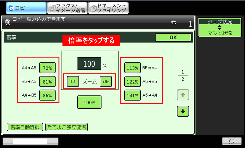 原稿サイズと用紙サイズが決まっている場合、最適な倍率を画面操作で選ぶことができます。また、用紙より少し小さくコピーするなどの微調整も可能です。