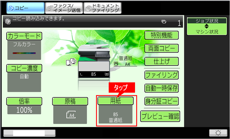 ②コピー基本画面の[用紙(例:B5)]を確認してください。