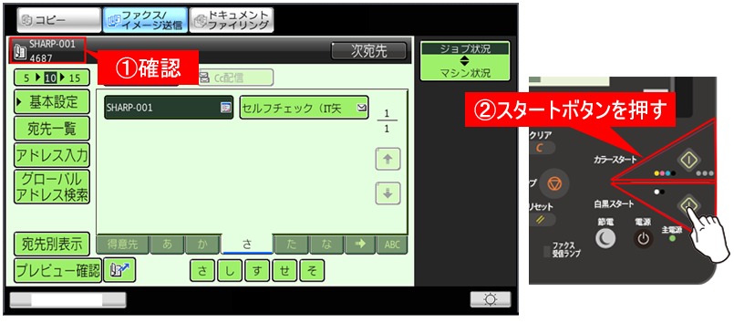 ⑤送信先を確認後、[スタート](本体ボタン)を押し、読み込みを開始します。