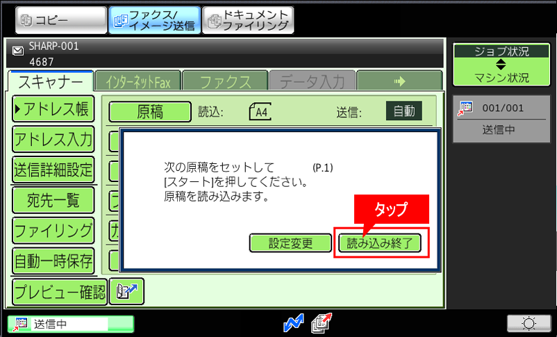 ⑥「次の原稿をセットして[スタート]を押してください。原稿を読み込みます。」が表示されますので、次の原稿がある場合は原稿を入れ替えて[スタート](本体ボタン)を押してください。次の原稿が無い場合は[読み込み終了]を押してください。
