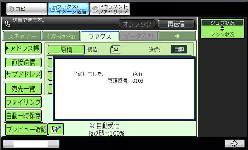 「予約しました。」の画面が表示されましたら、送信先にファイルが保存されていることを確認してください。