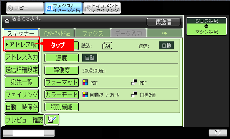 ③「スキャナー」タブを選択し、[アドレス帳]を押してください。