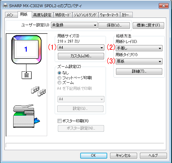 (3)「用紙タイプ(Y):」:「厚紙」