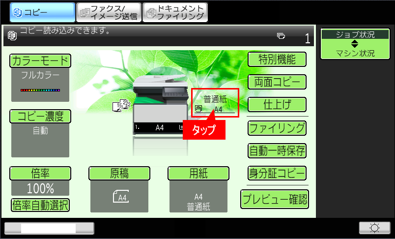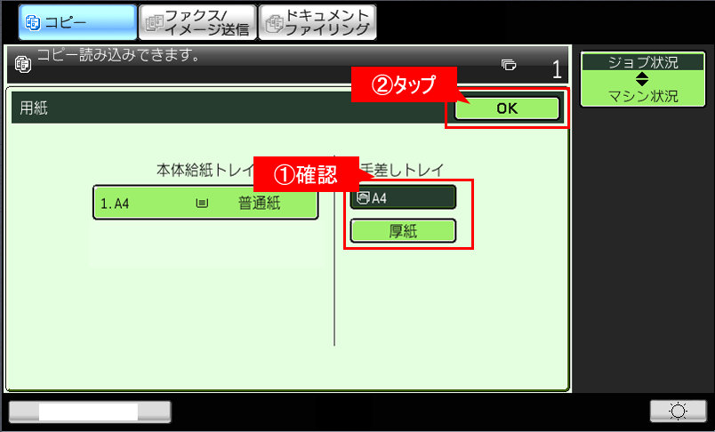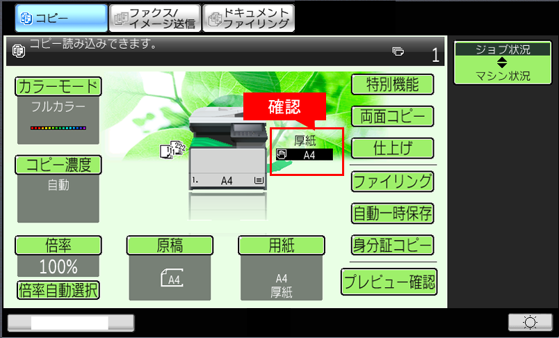 ⑧複合機のコピー基本画面で「用紙タイプ」が「厚紙」、「用紙サイズ」が「A4」になっていることを確認してください。