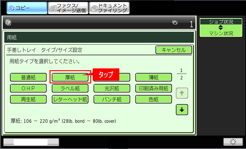 厚紙に印刷するには、コピー基本画面の「用紙」画面で厚紙を指定して印刷します。
