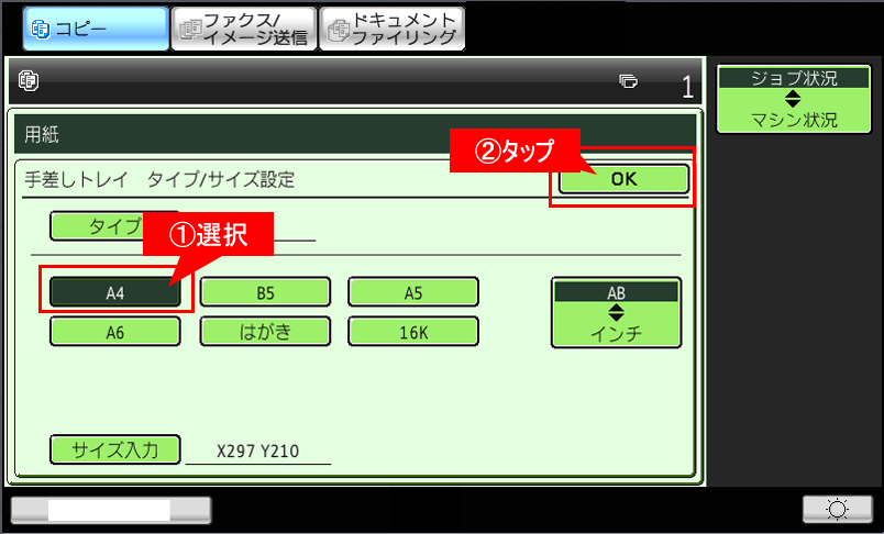 ②複合機のコピー基本画面で「手差し」アイコンを押してください。