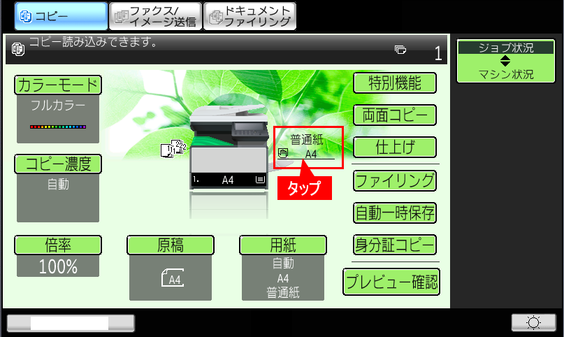 ②複合機のコピー基本画面で「手差し」アイコンを押してください。