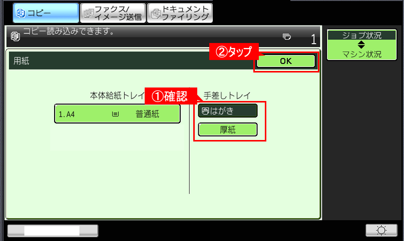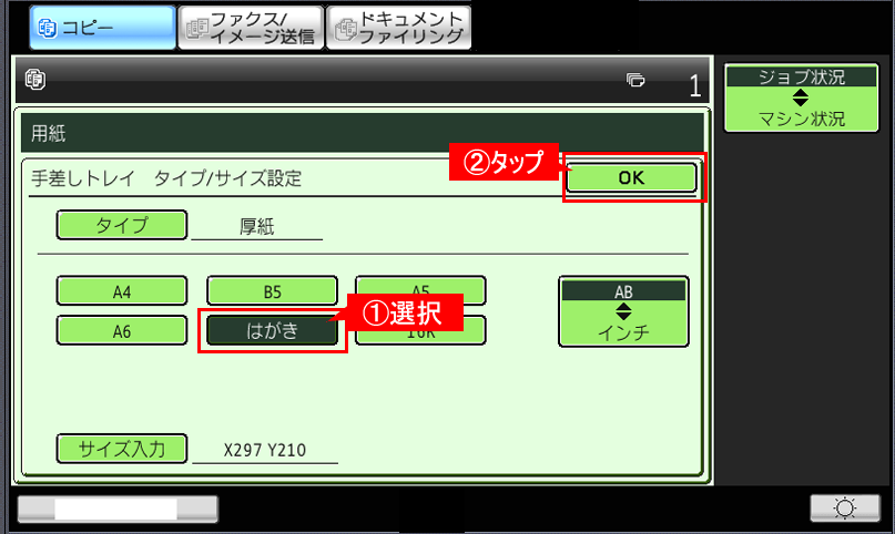 ⑧複合機のコピー基本画面で①「用紙タイプ」が「厚紙」、②「用紙サイズ」が「はがき」になっていることを確認してください。