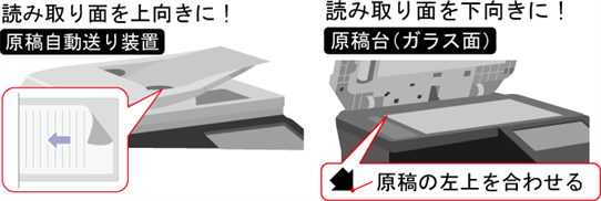 ②原稿を原稿自動送り装置の原稿セット台、または原稿台(ガラス面)にセットしてください。