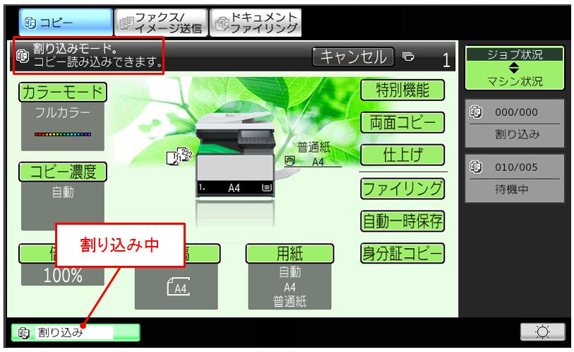 コピー基本画面の[割り込み]を押すと、簡単に割り込みコピーができます。