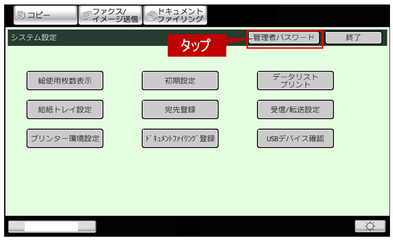 ②「システム設定」画面が表示されますので、[管理者パスワード]を押してください。