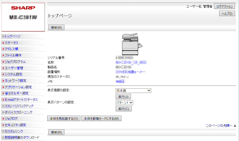 (表示されたWeb管理画面では、複合機の状態確認や設定・変更が可能です。)