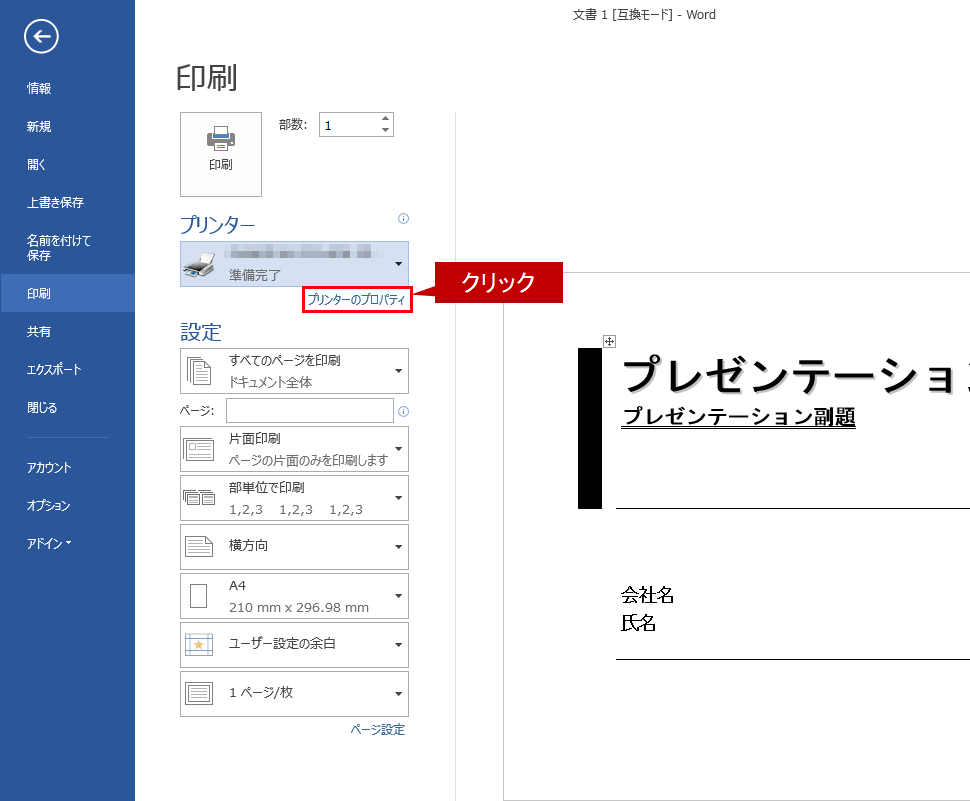 ①アプリケーション(例:Word文書-Office2013-)で[印刷]を押し、