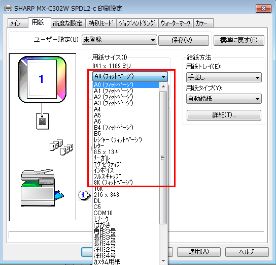 A0用紙を指定できるCAD等のアプリケーションから印刷する場合に使用します。