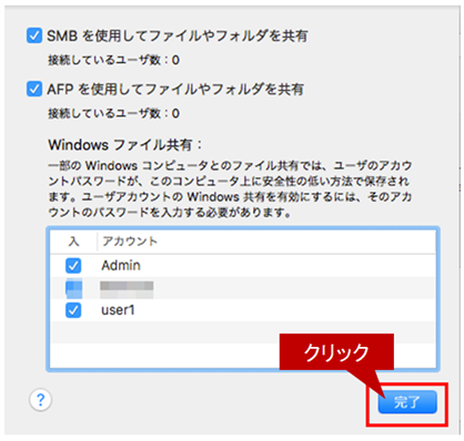 ⑦「SMB (Windows) を使用してファイルやフォルダーを共有」とリストの「user1」 にチェックを入れ、[完了] を押してください。