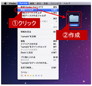 ②メニューバーより [ファイル]→[新規フォルダ] を押し、デスクトップ上に「sample」 フォルダーを作成してください。