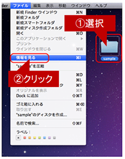 ③「sample」 フォルダーを選択し、メニューバーより [ファイル]→[情報を見る] を押してフォルダー情報を表示してください。