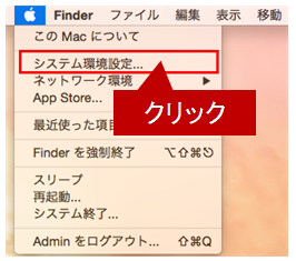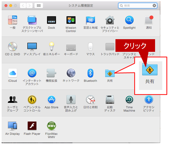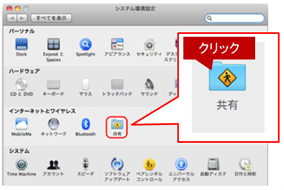 ②「システム環境設定」画面が表示されますので、[共有]を押して下さい。