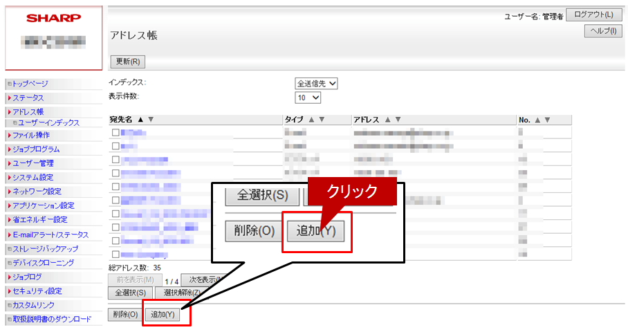 ③「アドレス帳」が表示されますので、[追加(Y)]を押してください。