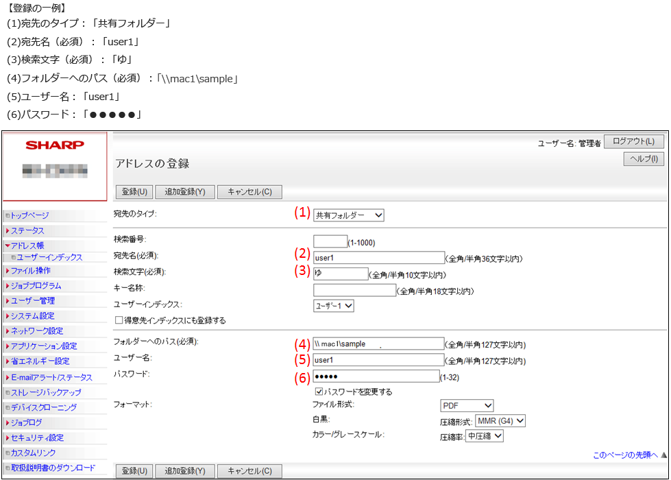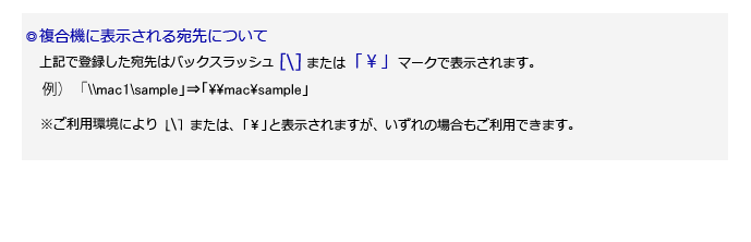 複合機側でMac OS Xの共有フォルダーに接続するための宛先をアドレス帳に登録します。