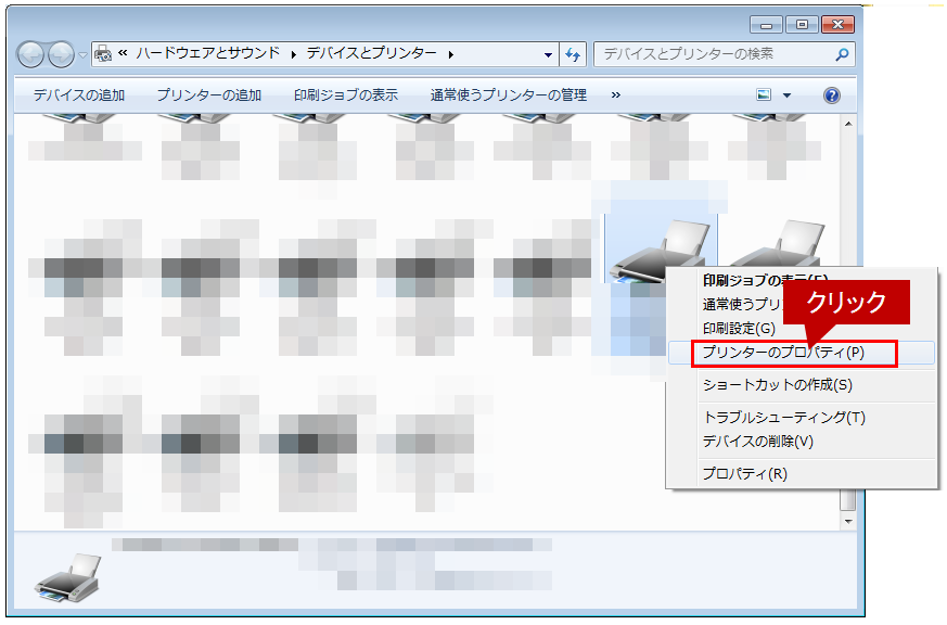 ②「デバイスとプリンター」画面が表示されますので、当該プリンターを選択後、右クリックして[プリンターのプロパティ(P)]を押してください。