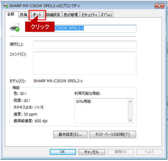 ③「当該プリンターのプロパティ」画面が表示されますので、[ポート]タブを押してください。