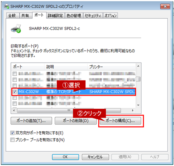 ④「印刷するポート」設定画面が表示されますので、①ポート欄でこれまで使用していた複合機の名前(またはIPアドレス)を選択し、②[ポートの構成(C)]を押してください。