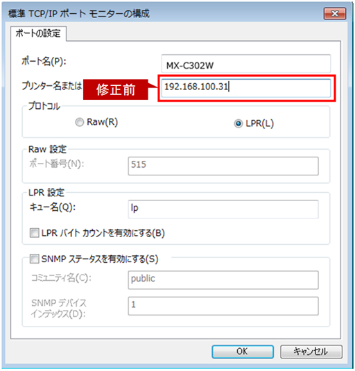 ⑤「標準TCP/IPポートモニターの構成」画面が表示されますので、「プリンター名またはIPアドレス(A)」に新しいプリンター名またはIPアドレスを設定してください。