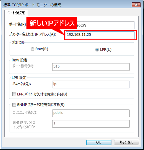 ⑤「標準TCP/IPポートモニターの構成」画面が表示されますので、「プリンター名またはIPアドレス(A)」に新しいプリンター名またはIPアドレスを設定してください。