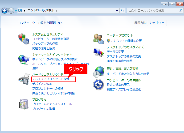 ①パソコンの「印刷ポート」を確認をするために、「コントロールパネル」の[デバイスとプリンターの表示]を押してください。