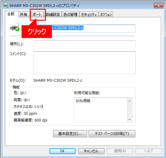 ③「当該プリンターのプロパティ」画面が表示されますので、[ポート]タブを押してください。
