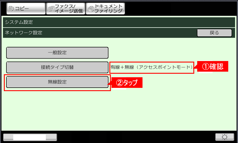 ⑩本体を再起動後、「ネットワーク設定」画面で「有線+無線(アクセスポイントモード)」になっていることを確認し、[無線設定]をタップしてください。