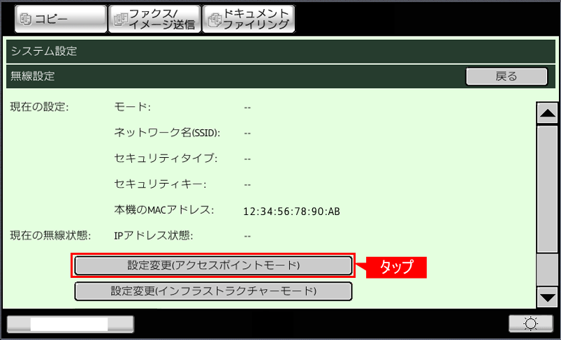 複合機の無線設定で「アクセスポイントモード」に設定します。