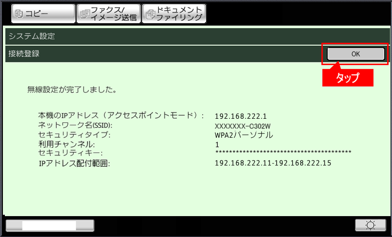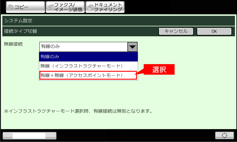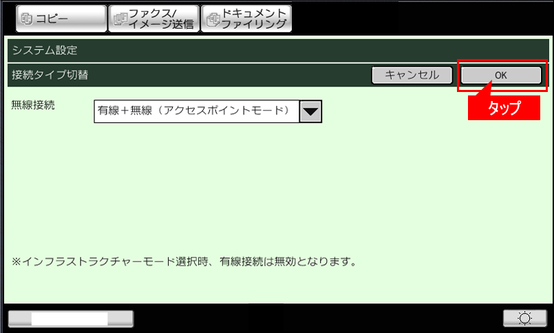 ⑦[無線接続]が「有線+無線(アクセスポイントモード)」になっていることを確認し、[OK]をタップしてください。