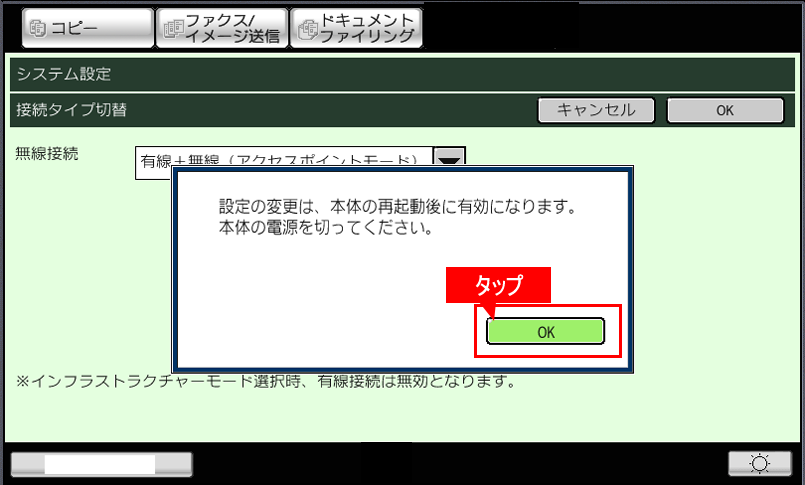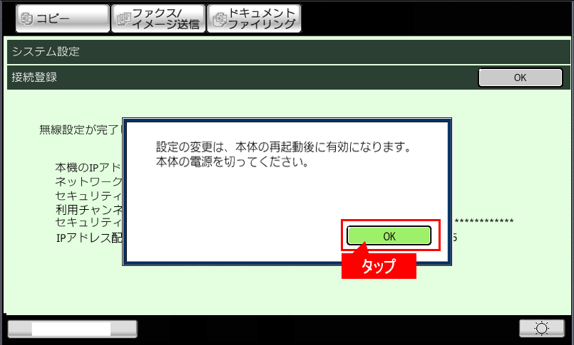 ⑮「設定の変更は、本体の再起動後に有効になります。本体の電源を切ってください。」の画面が表示されますので、[OK]をタップして、本体を再起動してください。