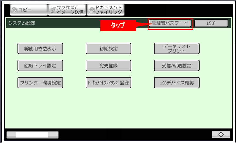 ②「システム設定」画面が表示されますので、[管理者パスワード]をタップしてください。