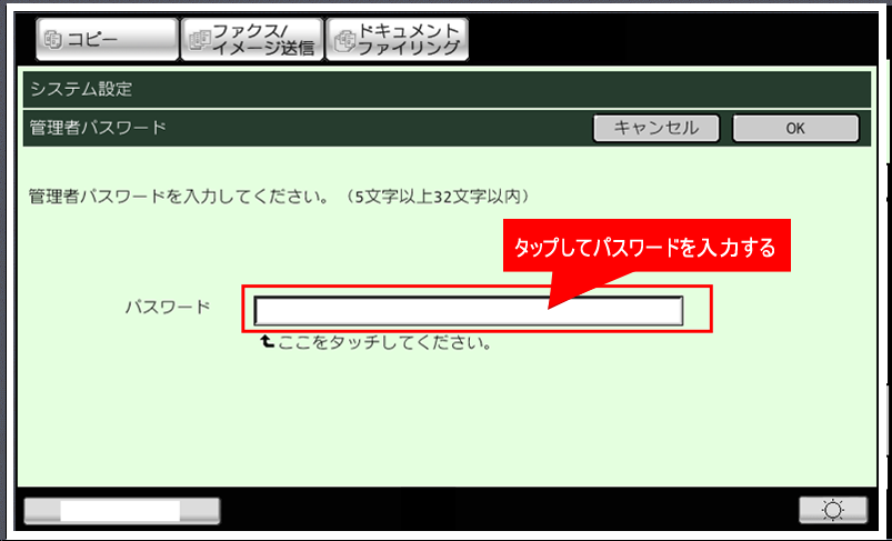 ③「管理者パスワード」画面が表示されますので、パスワードを入力し[OK]をタップしてください。