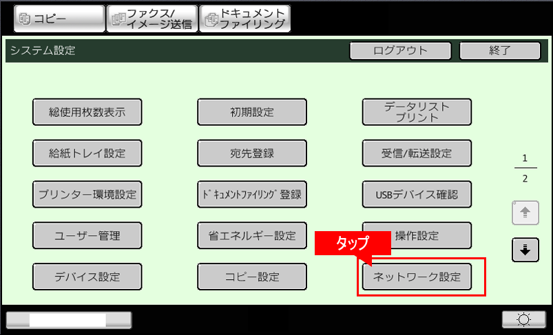 ④「システム設定」画面が表示されますので、[ネットワーク設定]をタップしてください。