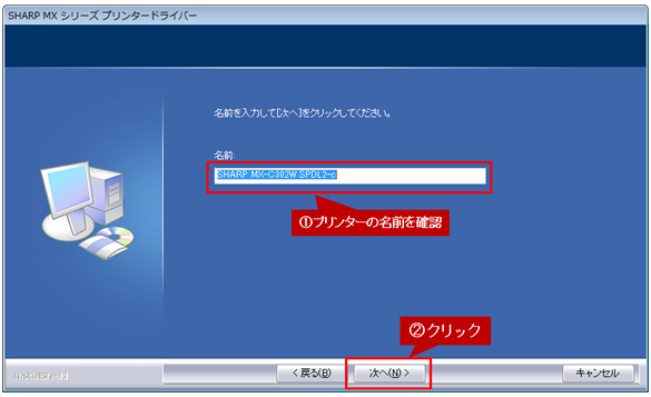 プリンターの名前を確認し、[次へ]ボタンをクリックします。