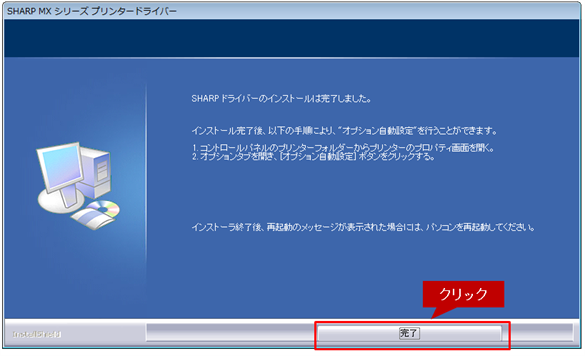 インストールの完了画面が表示されたら、[完了]ボタンをクリックしてください。