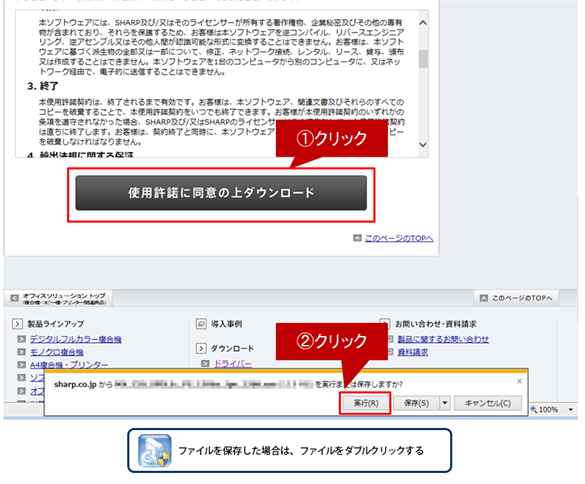 [使用許諾に同意の上ダウンロード]ボタンをクリックし、表示されたウィンドウにある[実行]ボタンをクリックします。ファイルを保存した場合は、ファイルをダブルクリックします。