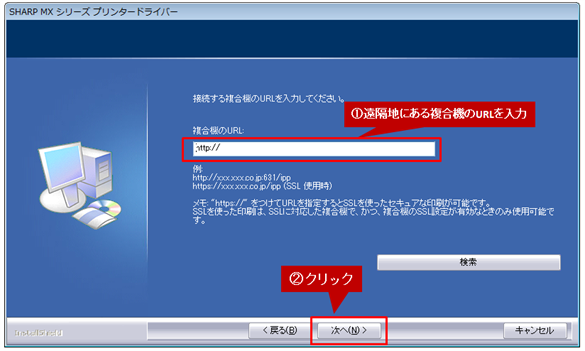 遠隔地にある複合機のURLを入力し、[次へ]ボタンをクリックします。