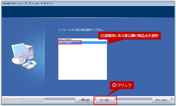 遠隔地にある複合機の製品名を選択し、[次へ]ボタンをクリックします。