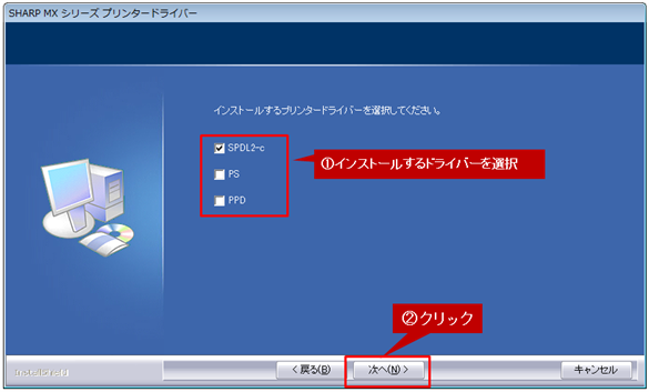 インストールするプリンタードライバーを選択し、[次へ]ボタンをクリックします。