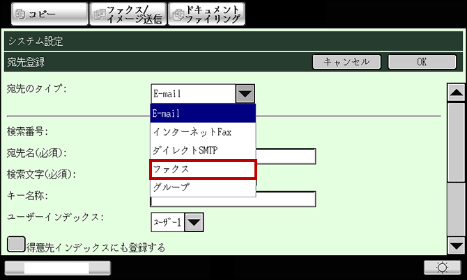 ⑤ 宛先のタイプで「ファクス」を選択してください。