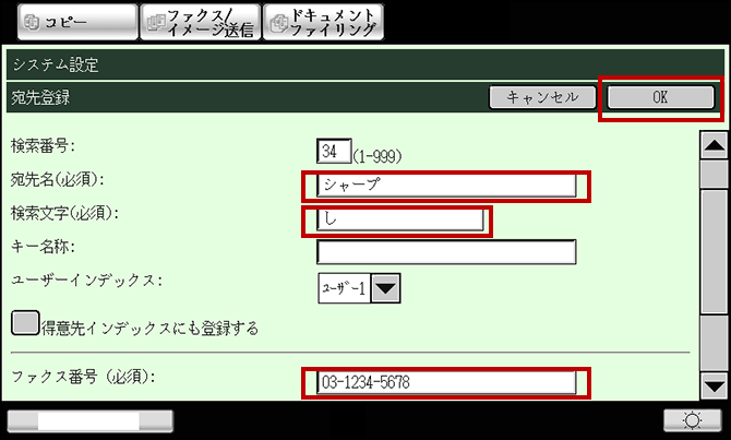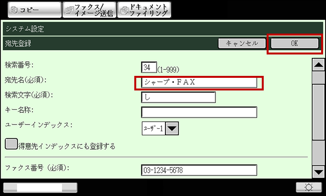 ⑥ 必須項目の "宛先名"と"検索文字"と"ファクス番号"を入力し、[OK]を押してください。