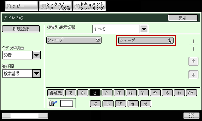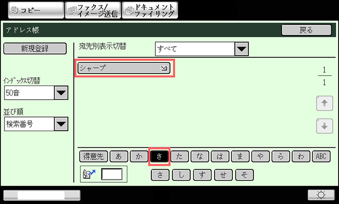 ⑧ 「アドレス帳」画面で、さ行の[さ]を選択し、登録した宛先が表示されていることを確認してください。