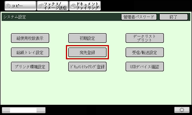 ② 「システム設定」画面が表示されますので、[宛先登録]を押してください。