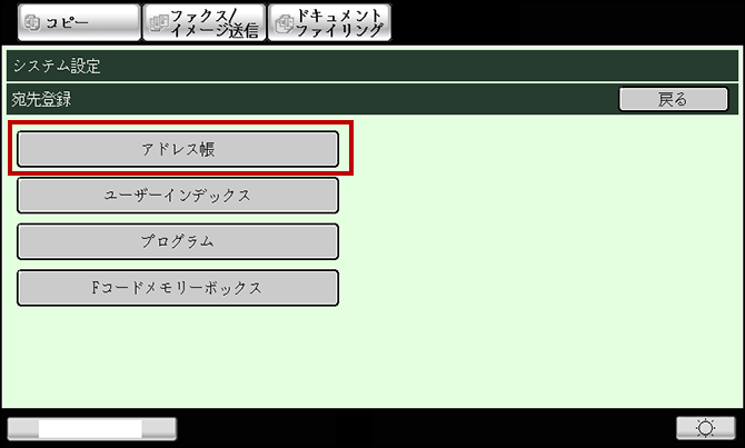 アドレス帳に宛先を新規登録するときや、登録済みの宛先を変更したり、削除するときは、システム設定の「宛先登録」から「アドレス帳」画面を表示してください。