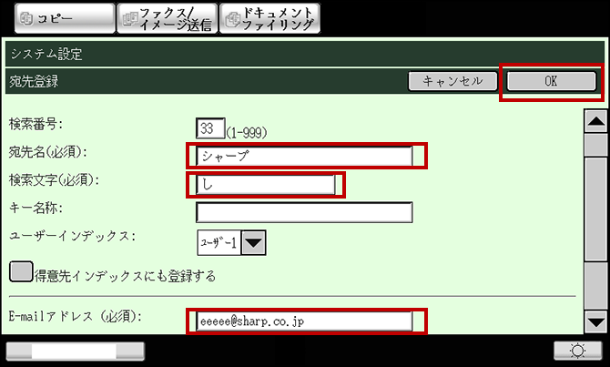 ⑥ 必須項目の "宛先名"と"検索文字"と"E-mailアドレス"を入力し、[OK]を押してください。